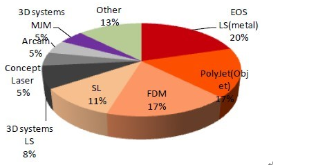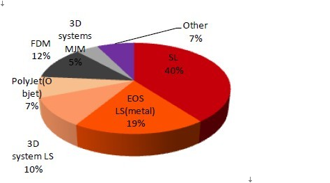 根據(jù)WohlersAssociates在2011-2012年的調(diào)查顯示:現(xiàn)階段,下游打印服務商安裝最多的是基于立體平板印刷(SL)技術的3D打印設備,占比高達40%。作為最早成形的3D打印技術,占據(jù)較高的市場份額在情理之中。同時,技術發(fā)展相對較晚,以金屬為材料的激光打印設備,占比已經(jīng)接近20%。如圖50所示。